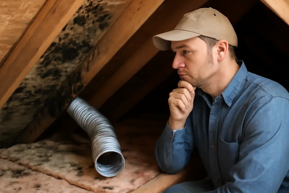 If your attic smells like a locker room and your roof sheathing looks like it lost a fight with a pepper shaker, your bathroom fan…